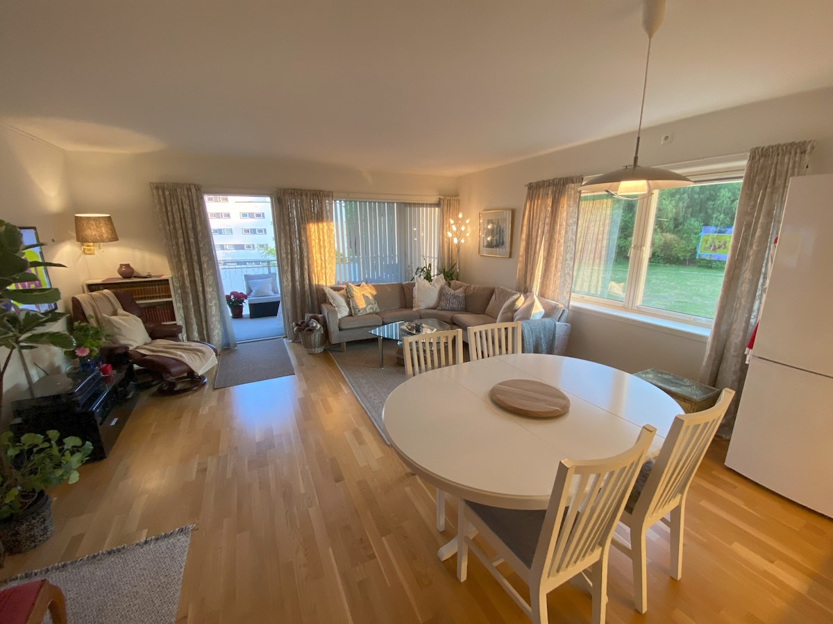 Perfecto para parejas, amigos o viajeros solitarios que quieran alojarse en un entorno verde y tranquilo a solo 18 minutos del teatro nacional y el corazón de Oslo. Alquilo mi apartamento, ya que soy estudiante en otra ciudad en este momento, por lo que, por supuesto, tiene pertenencias personales, pero puede ser agradable y tener un lugar con estilo personal. Estacionamiento gratuito para autos y a solo 4 minutos a pie de la estación de tren.