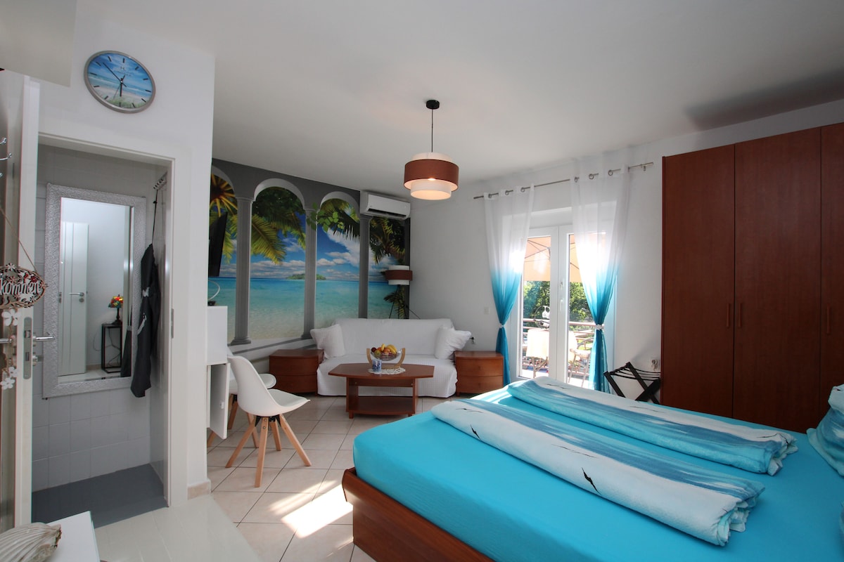 Blue Adria Suites son apartamentos estudio privados, cada uno ideal para 2 personas. Los apartamentos tipo estudio contienen ducha / inodoro privado, cama doble, cocina mini bloque con nevera, lavabo, 2 placas eléctricas y cafetera de filtro, y un sofá. Cada estudio tiene un balcón con una sombrilla y una zona de estar para 2 personas, con vistas al jardín o a una calle tranquila. Los apartamentos tipo estudio tienen aire acondicionado y los huéspedes tienen acceso a wifi. Se proporciona estacionamiento frente a la casa o a lo largo de la calle.