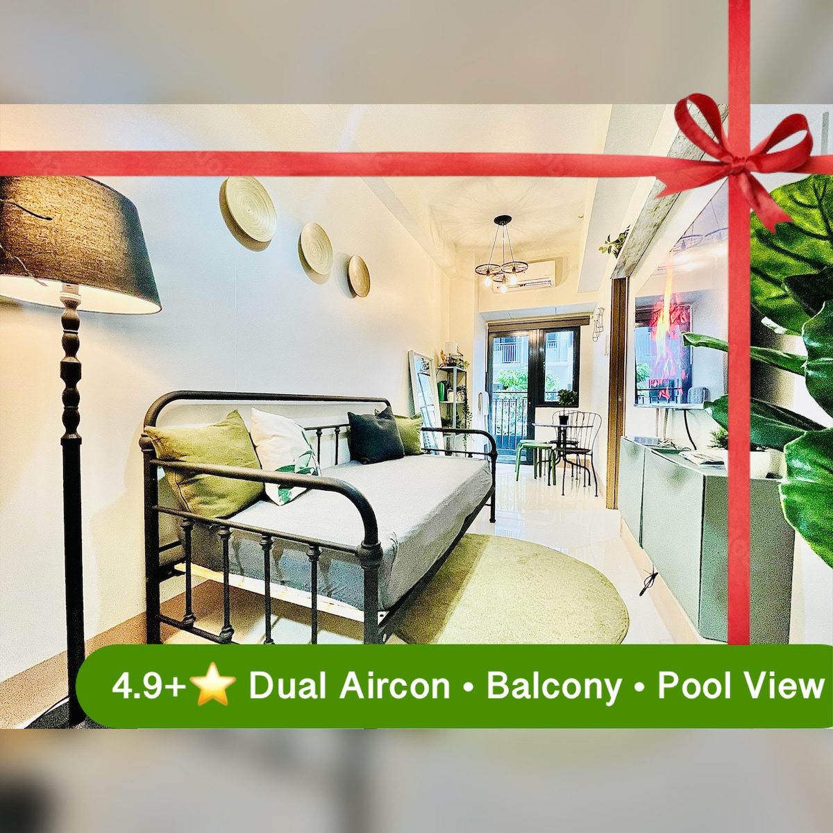 Despierta con las palmeras tropicales como tu vista desde tu cama a través de la puerta de vidrio. Cuenta con cama tamaño queen y colchón orto de calidad hotelera, almohadas y ropa de cama para una experiencia de lujo para dormir. Equipado con tus necesidades básicas de cocina pequeña. A 800 metros del centro comercial Mall of Asia, a 20 minutos del aeropuerto, teatros, Explanada, Con alfamart, Starbucks y restaurantes en la planta baja. La piscina es accesible por una tarifa. Salta directamente desde tu balcón a la piscina después del registro previo y accede fácilmente a tu unidad por un paso dedicado.