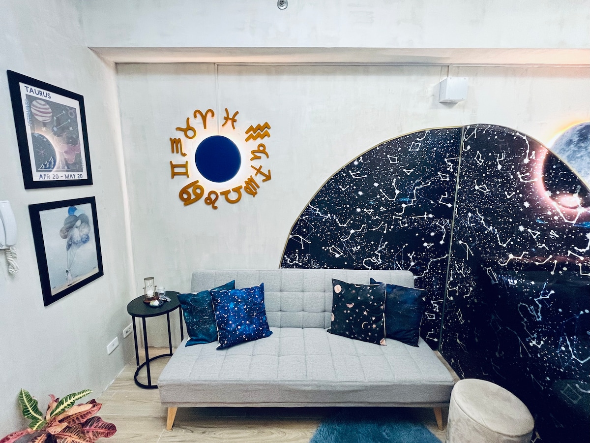 ¡Es un letrero para reservar esta unidad inspirada en el zodiaco astro! Las estrellas y el universo han planeado que pases tiempo de calidad, te relajes, medites y simplemente disfrutes de esta casa única. Equipado con un televisor grande de tamaño fuera de este mundo con Disney, microondas caliente de asteroides, refrigerador de galaxia congelante, cama y sofá de nube nueve, esquina de zodíaco 📸 ig e iluminación de superluna. 🔮✨🪬🪐 Ubicado en SMDC Mezza II, Ciudad Quezón. Elementos básicos cerca. La unidad tiene balcón y vista a la piscina. Se requiere un documento de identificación🆔 válido para la autorización de la carta del huésped.
