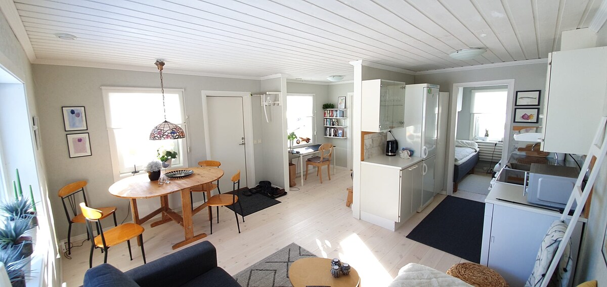 Ubicada en la isla de Ön (una isla en el río Umeälven) y a poca distancia tanto del aeropuerto como del centro de Umeå, encontrarás esta microcasa sobre ruedas. La casa está totalmente equipada con todas las comodidades y tú eliges si quieres comprar el desayuno o prepararlo en la bonita cocina. En verano, tenemos abierta la tienda de artesanía y la cafetería del jardín Eljest en la misma granja. Hay un amplio aparcamiento a unos 50 metros de la casa. Es posible cargar su coche eléctrico a precio de coste. Le damos la bienvenida.
