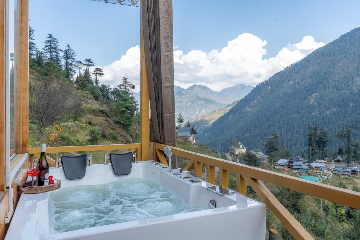 Acogedora cabaña en Jibhi | Jacuzzi y vistas a la montaña