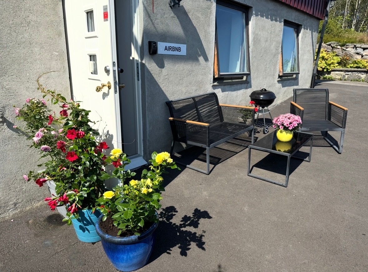 Vi er en familie med 3 drenge og en kat, der lejer underetagen ud. Lejligheden egner sig til 2 voksne, evt 1 barn. Vi deler hovedindgangen. Lejligheden har et lille køkken med spiseplads, køleskab, kogeplade og lille ovn. Seperat bad og toilet. Soveværelse med dobbeltseng (140*200) og sofa (sovesofa 140*200). Mulighed for at bruge vaskemaskine. Gratis parkering. Lademulighed mod betaling. 10min gang til busstop. Badestrand (Kyrkjetangen) 20min gang. Handlemulighed (Coop extra) 15min gang.