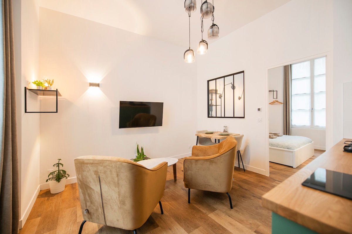 Apartamento renovado situado en pleno centro histórico de Sens, a dos pasos de la catedral, del mercado y de los comercios. Tranquilo y luminoso, ofrece un espacio acogedor con dormitorio separado por cristalera, sala de estar cómoda, zona de escritorio y cocina equipada. Baño moderno, lavadora secadora (parte común), ropa de cama incluida. Llegada autónoma, Wi-Fi. Estacionamiento fácil en las cercanías. Ideal para una estadía de negocios o un fin de semana en pareja.