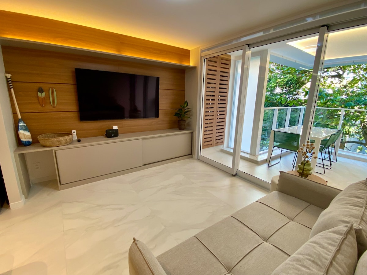 El alojamiento combina una ubicación privilegiada, una vista lateral del mar y comodidad para parejas y familias. Se encuentra en una zona concurrida de Copacabana, a solo unos pasos de la playa, con una gran variedad de tiendas y servicios. El espacio renovado tiene una cama tamaño king y una cama adicional, una cocina totalmente equipada, wifi, un televisor de 50”, aire acondicionado, llegada autónoma y conserje las 24 horas. El espacio se encuentra en el piso de la entreplanta con otras tres unidades, lo que garantiza la practicidad para grupos más grandes o familias que quieren viajar juntos, mientras mantienen la privacidad.