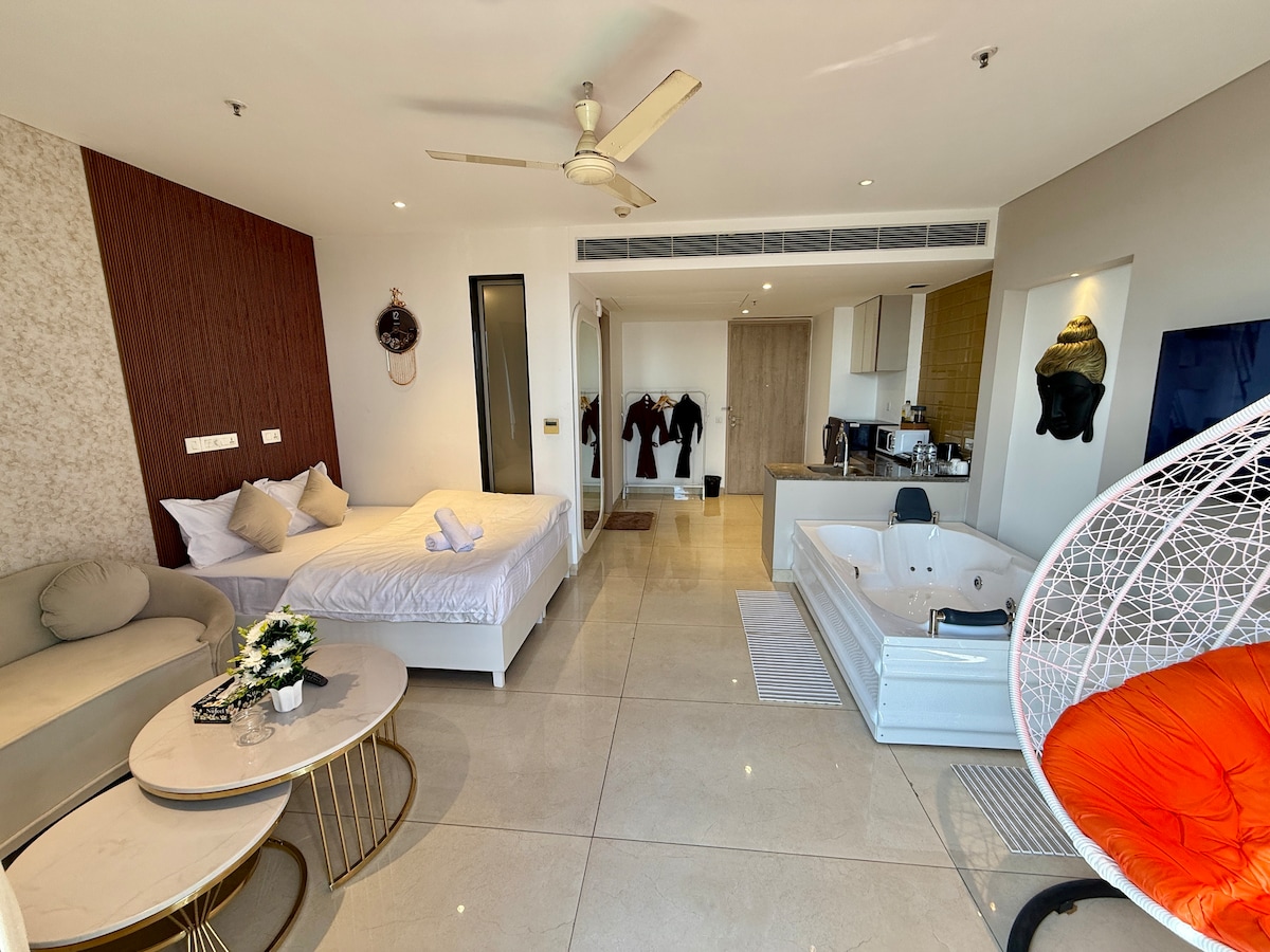 Te damos la bienvenida a esta otra propiedad de lujo de Tulip Homes que está situada en el piso 17 de un edificio de gran altura. El amplio patio con jardín y el jacuzzi de 2 plazas lo hacen único en la clase. El lugar es perfecto para relajarse y disfrutar de una vista panorámica de la arquitectura moderna. El apartamento está cargado con televisión inteligente (todas las aplicaciones funcionan), gran pared de espejo, una acogedora cama doble, un cómodo columpio, elegante sofá con mesas de centro de anidación centrales, nevera, microondas, inducción, hervidor eléctrico, tostadora, plancha y muchos más.