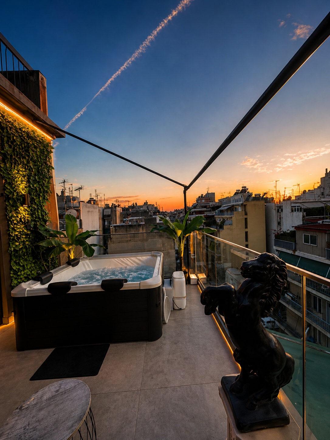 Experimenta el lujo moderno en este dúplex de 2 dormitorios en la vibrante Gazi, Atenas. Ambas habitaciones tienen baños en suite para mayor comodidad y privacidad. La piscina en la azotea ofrece impresionantes vistas a la ciudad y a la Acrópolis, mientras que el techo de cristal de la sala de estar ofrece una vista única de la piscina de arriba. Con una cocina elegante, interiores elegantes y una ubicación privilegiada, esta elegante casa combina comodidad y encanto para una estancia inolvidable.