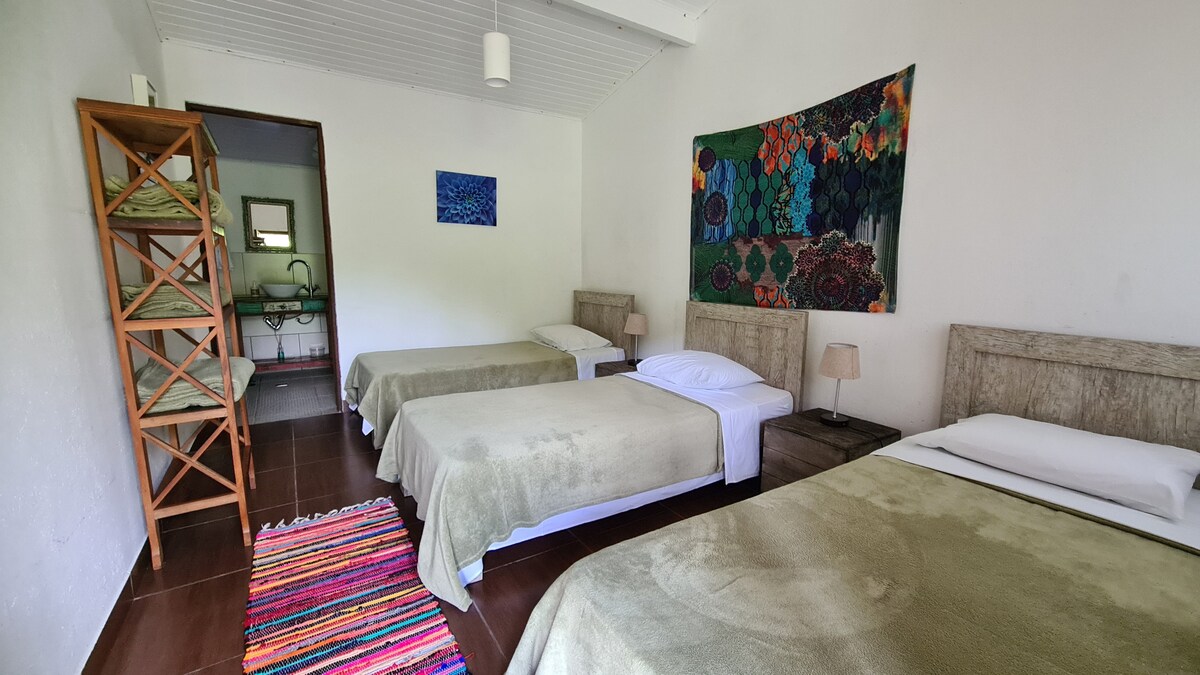 Alojamiento en medio de la reserva privada de Mata Atlantica. Todo el lugar está construido en reconstrucción, tranquilo y acogedor, no tiene iluminación eléctrica ni tomacorrientes, perfecto para desconectar y relajarse, además de disfrutar de los sonidos de la naturaleza y las estrellas en el cielo nocturno. El alojamiento incluye una cocina comunitaria con todo lo esencial y un baño con ducha de hidromasaje. También hay piscina natural (pequeño lago) y un salón multiusos. El acceso a la habitación requiere un paseo de 5 minutos por el bosque.