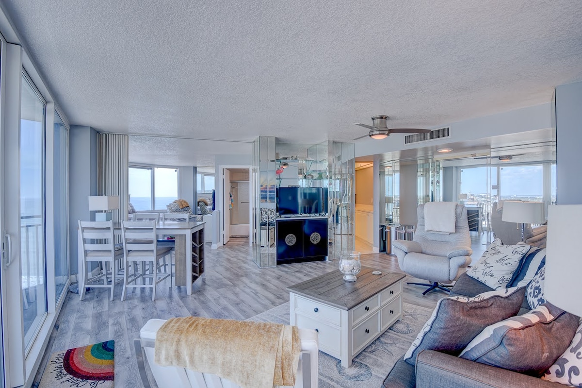 Apartamento de 2 dormitorios/2 baños frente al mar con capacidad para 6 personas con vistas panorámicas al mar y a la costa. Cocina completa, lavadora/secadora en el alojamiento, 2 televisores, piscina privada y jacuzzi, gimnasio completo, sala de billar, sala de ping pong con biblioteca y juegos. Sube en ascensor al restaurante del ático y disfruta de música en directo, cena y bebidas mientras contemplas la puesta de sol con vistas de 360 grados. Al lado tenemos el Shores Spa. Publix, Congo River y restaurantes ubicados cerca. No querrás irte una vez que hayas llegado. ¡Ven a visitarnos!