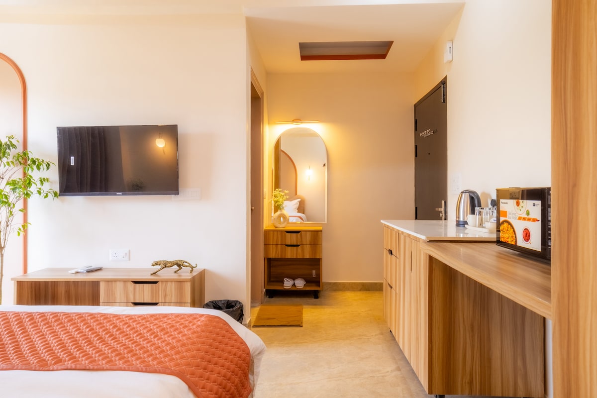 Administrado por Perch Service Apartments. La hospitalidad mejor valorada nos ha ayudado a ganar el corazón de nuestros huéspedes y varios premios desde 2011 • Departamento estudio de tamaño mediano con balcón: Moulsari Avenue • Cocina totalmente equipada (encimera, utensilios, cubiertos, refrigerador, microondas, etc.). • Cocina central, orden de habitaciones y salón de desayuno • Desayuno disponible a Rs 295/ persona • Gimnasio y salón de invitados con televisor inteligente grande • A 5 minutos caminando del Ambiance Mall y DLF Cyber City. • A 500 metros de la estación de metro de la avenida Moulsari.