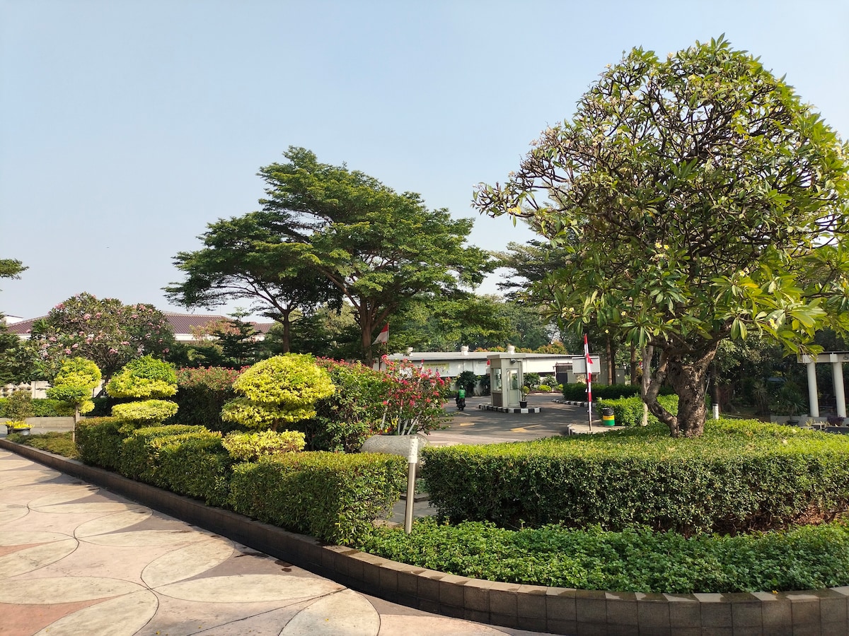 Lugar perfecto para fiestas familiares en el jardín con capacidad para hasta 50 huéspedes con sillas y mesas incluidas mientras se hospeda en el alojamiento. Disfruta de una estancia relajante en Omah Amas, un alojamiento acogedor rodeado de exuberante vegetación cerca del lago Situ Rawa Pulo donde puedes montar en una tabla de surf de remo sin cargo adicional. Disfruta de un retiro tranquilo mientras te hospedas cerca de la naturaleza y de las comodidades modernas Cerca de Ciputra y TransStudio Mall, fácil acceso a la puerta de peaje JatiKarya al aeropuerto, al centro de Yakarta, LRT