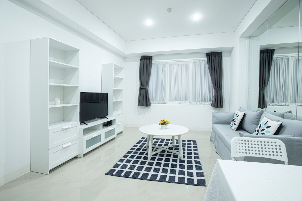 ¡Te damos la bienvenida! Si buscas un alojamiento elegante, espacioso y familiar a poca distancia del transporte público (LRT y Busway), ¡este alojamiento es para ti! Ubicado en Samara Suites Gatot Subroto, este apartamento de 2 dormitorios está en el mismo edificio que Citadines, por lo que tendrás una experiencia similar a la de un hotel sin dinero extra. La piscina infinita es probablemente el lugar más emocionante, puedes nadar mientras disfrutas de la vista panorámica de Yakarta. No dudes en ponerte en contacto conmigo para obtener más información.