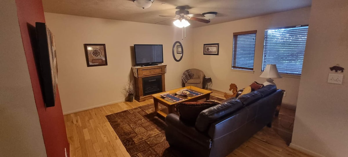 Esta casa adosada de 2 dormitorios y 2 baños limita con el Parque Nacional Grand Teton, que ofrece la ubicación perfecta para tus vacaciones en Jackson Hole. Nuestra casa adosada tiene 2 dormitorios arriba (camas tamaño queen) con un baño compartido. Nota: El segundo baño está abajo, junto a la cocina. Ambos baños tienen duchas pequeñas, sin bañeras. La sala de estar cuenta con una sala de estar con TV y chimenea de leña. El comedor y la cocina están junto a la sala de estar. Hay una lavandería en la planta baja.