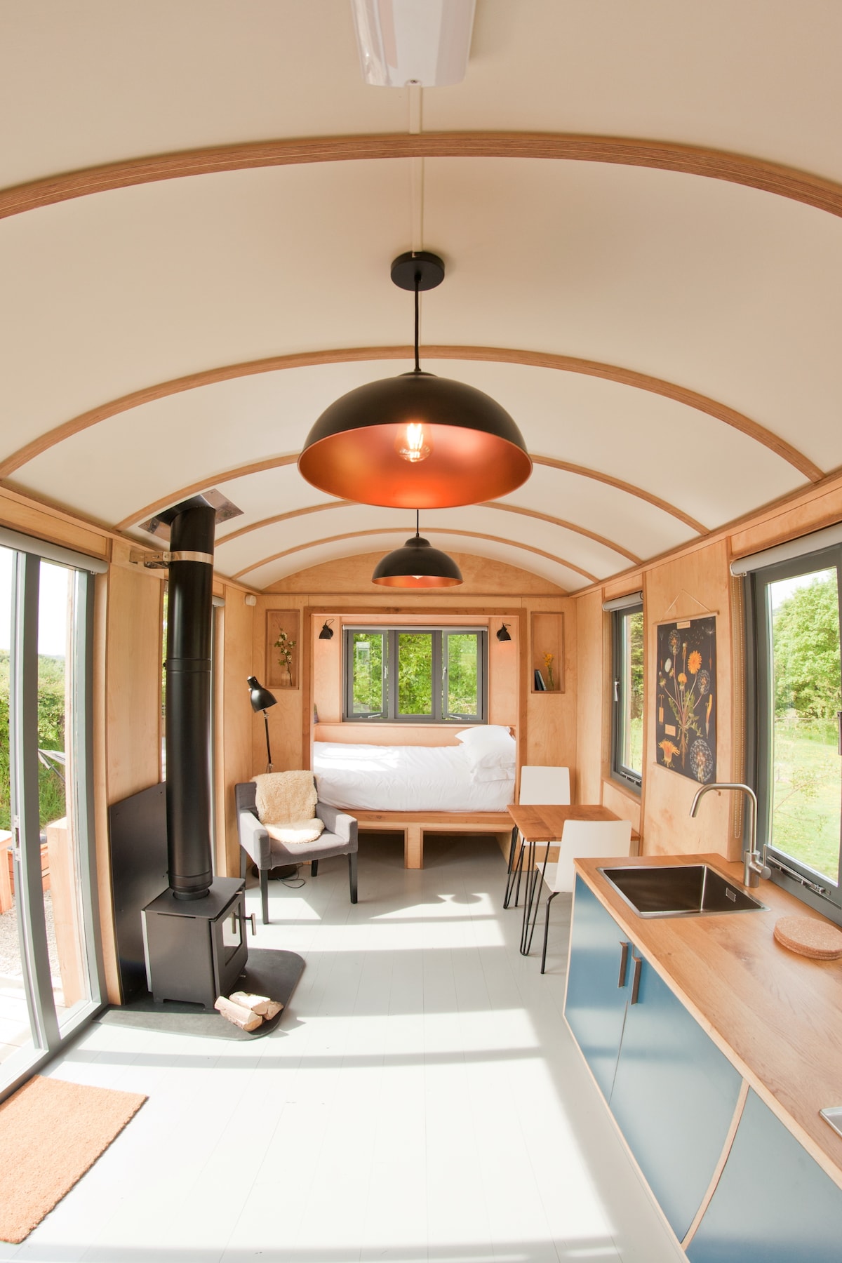 A converted horse box with all amenities, including a power shower, wood burning stove, boiler and radiators, a full kitchen and a veranda looking over the river with table and chairs.you have private use of a hot tub which is secluded also overlooks the river. More recently we have enclosed private space next to the horsebox, with a hammock, barbecue, patio, table and chairs.