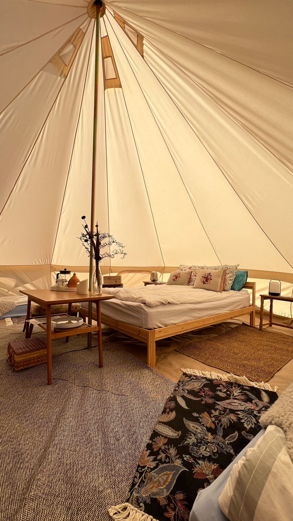 Dejligt telt med kig til stjernene gennem ovenlys vindue. God box madras 140 X 200 cm og 2 enkelt senge med skummadrasser Dyner, sengetøj og håndklæder. Stole, borde og service. Vandkoger og mulighed for at lave kaffe og the. Bade og toiletter på gården. Bålsted og mulighed for at lave mad og bål på rist . Grill og camping komfur. Sauna med koldvandskar og gode olier - 250 kr Morgenmad 120 kr Aftensmad 150 kr Lille butik på gården hvor der kan købes drikkevarer, is snacks.