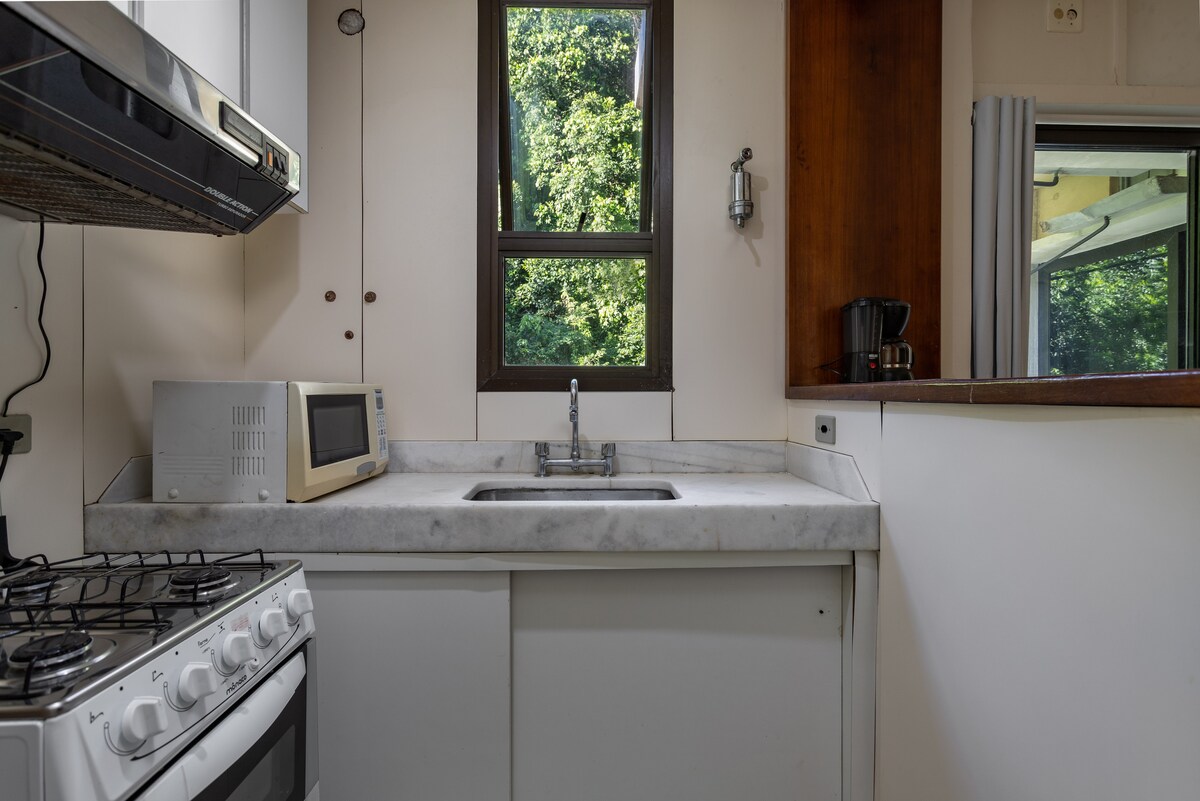 Hermosa suite , balcón gourmet, vistas a la playa de Barra da Tijuca, Pedra da Gávea y Canal da Barra. Pequeño balcón con encimera de lavavajillas, equipado para comidas rápidas y prácticas con microondas, freidora de aire, sándwichera, cafetera, tostadora , minibar, cubiertos, platos, vasos y pequeñas ollas de microondas. LA ATENCIÓN NO TIENE ESTUFA NI SARTENES. Habitación cómoda con mesa y 2 sillas, cama doble, armario y aire acondicionado. Baño con ducha de agua fría y caliente.