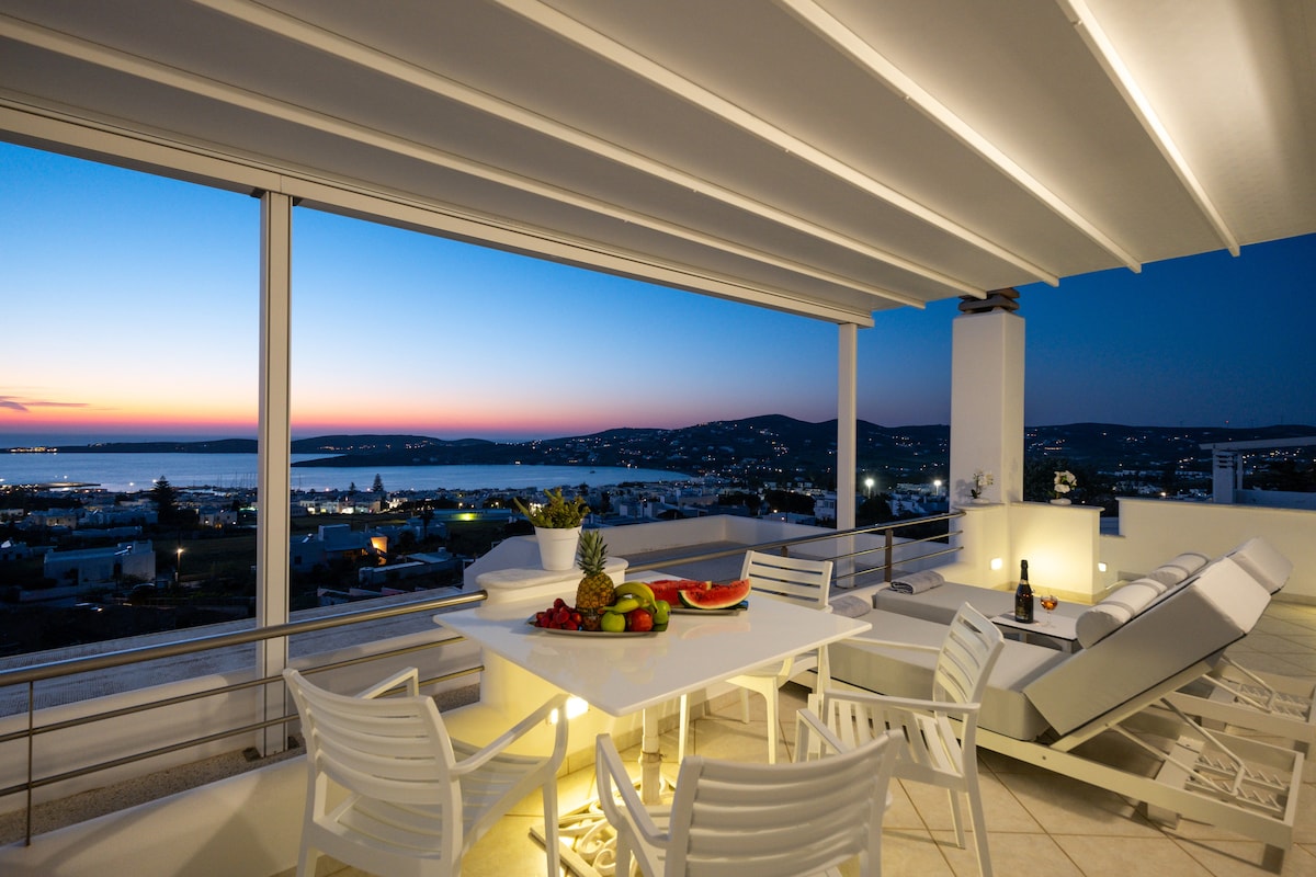 The suite Panos is an elegant suite located in Parikoia, the capital of Paros, and it is situated just 800m. far from the harbor and the cosmopolitan beach of Livadia. Enjoy this open spaced and luxuriously furnished suite (80sq.m.) with its big private balcony (100sq.m) and the beautiful view to the natural bay of Paroikia. You will never forget the unique sunsets and the view of the surrounding islands of Serifos, Sifnos and Syros.