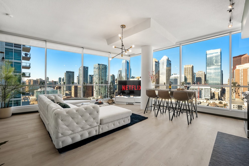 ¡Te damos la bienvenida a nuestro impresionante condominio en la esquina del centro de Calgary! Este moderno refugio te ofrece la combinación perfecta de comodidad, lujo y vistas impresionantes. Al entrar, te cautivarán de inmediato las ventanas del piso al techo que muestran el impresionante horizonte de la ciudad y las majestuosas vistas a las montañas. Ten en cuenta que las puertas delanteras del edificio se cierran a las 10:00 p. m. Si reservas, tendrás que recoger la llave o el control remoto en una ubicación diferente. *** LA PISCINA está cerrada durante el invierno.