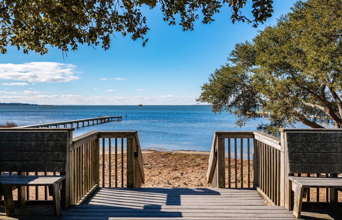 Welcome to "Seas the Bay" surrounded by water and majestic live oaks! This quaint 1,000 sqft cottage offers stunning views of Kitty Hawk Bay from the house, deck, & dock. Just 5 min from the beach, local food, & nightlife. Our dock on the bay is a perfect place to enjoy sunrises on the water. This listing is for 4 guests, perfect for a family, friends, or couples. Another airbnb rental is on the same property to the left, there is shared parking, but no living spaces shared.