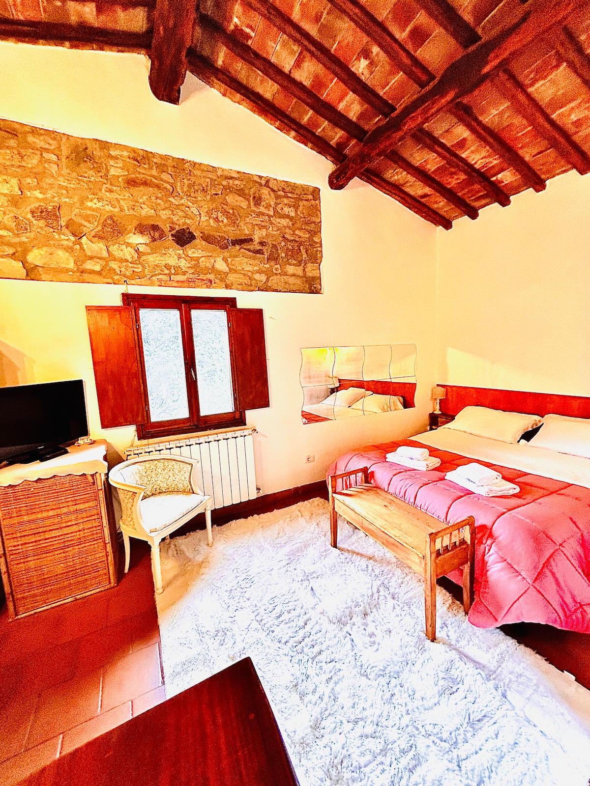 Pequeño y acogedor apartamento para 2 personas amueblado en estilo toscano y con vigas a la vista, inmerso en las suaves colinas de la campiña toscana. Los huéspedes tienen a su disposición un espacio exterior con mesa, piscina compartida, horno de leña y barbacoa, pequeña lavandería y wifi. El apartamento se ha construido a partir de una bonita casa de campo de piedra del siglo XIX, recientemente restaurada según la tradición toscana y dividida en tres cómodos apartamentos.