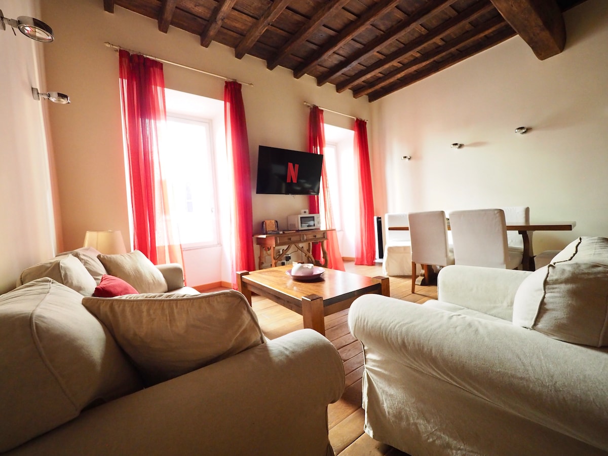 Luminoso apartamento en el 3er piso de un edificio del 1500. Ofrece 2+2 plazas. Consta de salón comedor con cocina y sofá cama, dormitorio y baño. Climatizado, silencioso, equipado con TV LCD y wifi. El apartamento tiene acceso directo a una hermosa azotea con vistas, este espacio es compartido con el otro apartamento de mi propiedad que también se alquila en el sitio. Ubicación MUY CÉNTRICA, a pocos pasos de Piazza Campo de' Fiori y Piazza Navona.