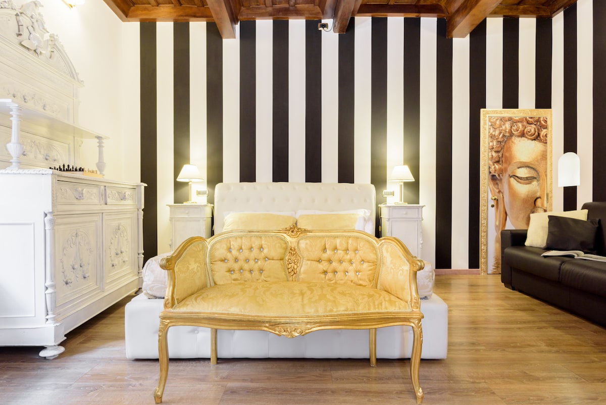 Our luxury apartment is located a stone's throw from the famous Spanish Steps, the Trevi Fountain and the most elegant shops in the world on via Condotti. Admire the mix of ancient and modern: original 18th century beams and fine antique furniture alongside contemporary comforts and furnishings. Have a coffee on the golden sofa and then go to discover Rome.