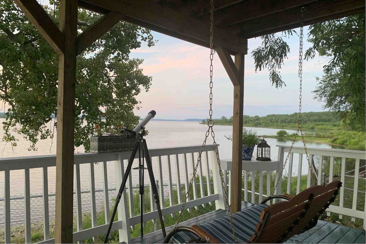 If you have an appreciation for the arts our house is it . Our home is redone to incorporate local artistry. Wrap around deck & open floor plan. Master has its own deck on river. Enjoy the evening watching boats or in hot tub on deck. Washer, dryer, fully equipped kitchen, 2 stall garage. Wood & gas fire pits. Pet friendly for up to 2 well behaved puppies.Must register. 2 Kayaks for the water. Use at own risk. 15 minutes from Peoria. Private access to water. Come enjoy the artistic surroundings!