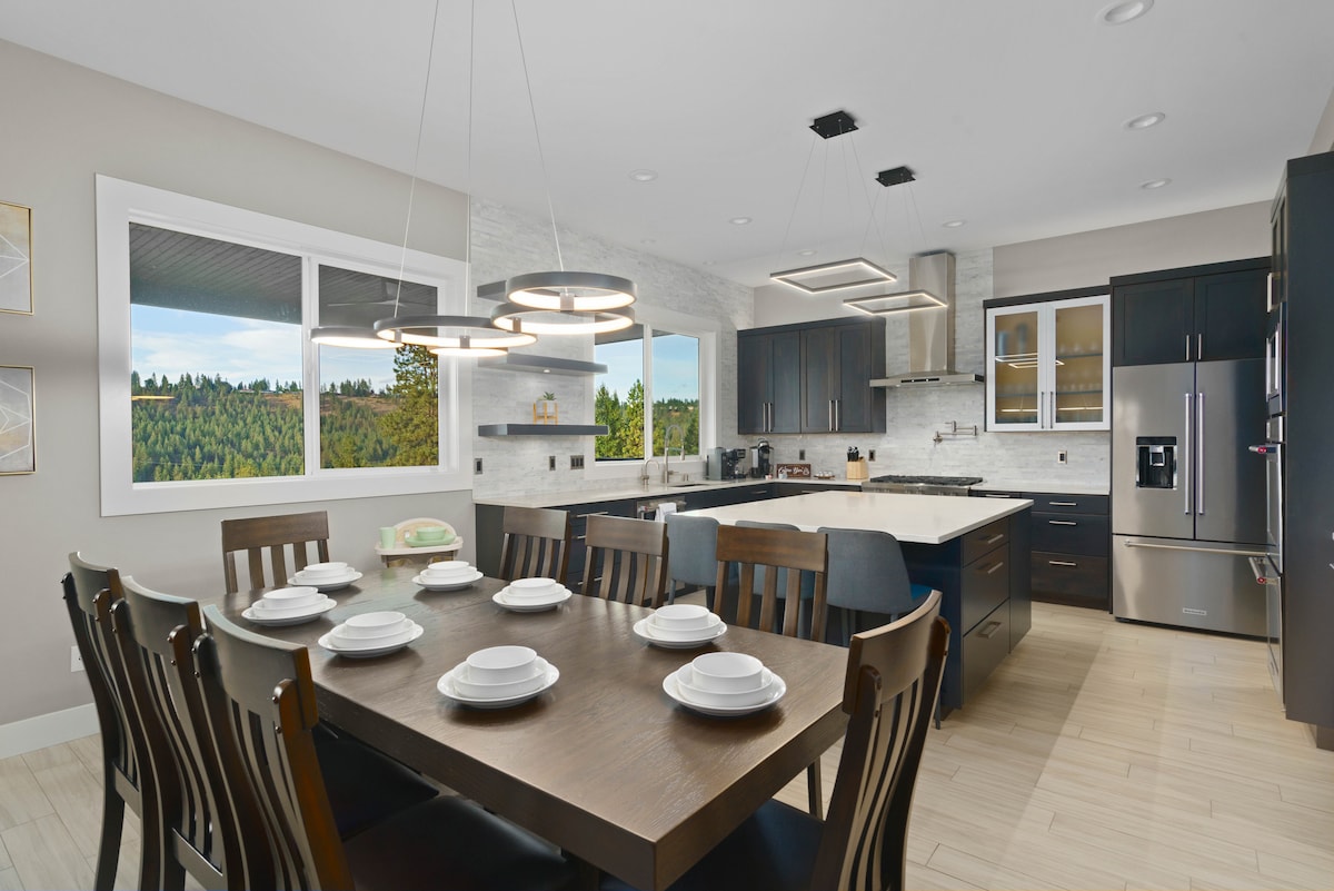 Vista ⛰️panorámica a la montaña y comodidades de primer nivel 🍿Teatro y salas de juegos Jacuzzi 🌅grande nuevo ¡Se admiten🐶 mascotas! Tenemos un gran patio trasero con césped vallado. Estación de carga de⚡️ Tesla 🍗Comedor en el patio con parrilla a gas 🧸Practicuna o cuna de viaje 💫 Perfecto para familias con niños, retiros, deportes, bodas, vacaciones, vacaciones en casa Casa de 3849 pies cuadrados de🏡 nueva construcción cerca del centro y Gonzaga 🧺Lavandería con lavabo, lavadora y secadora 🧹 Limpieza profesional ★¡Reserva hoy! ★