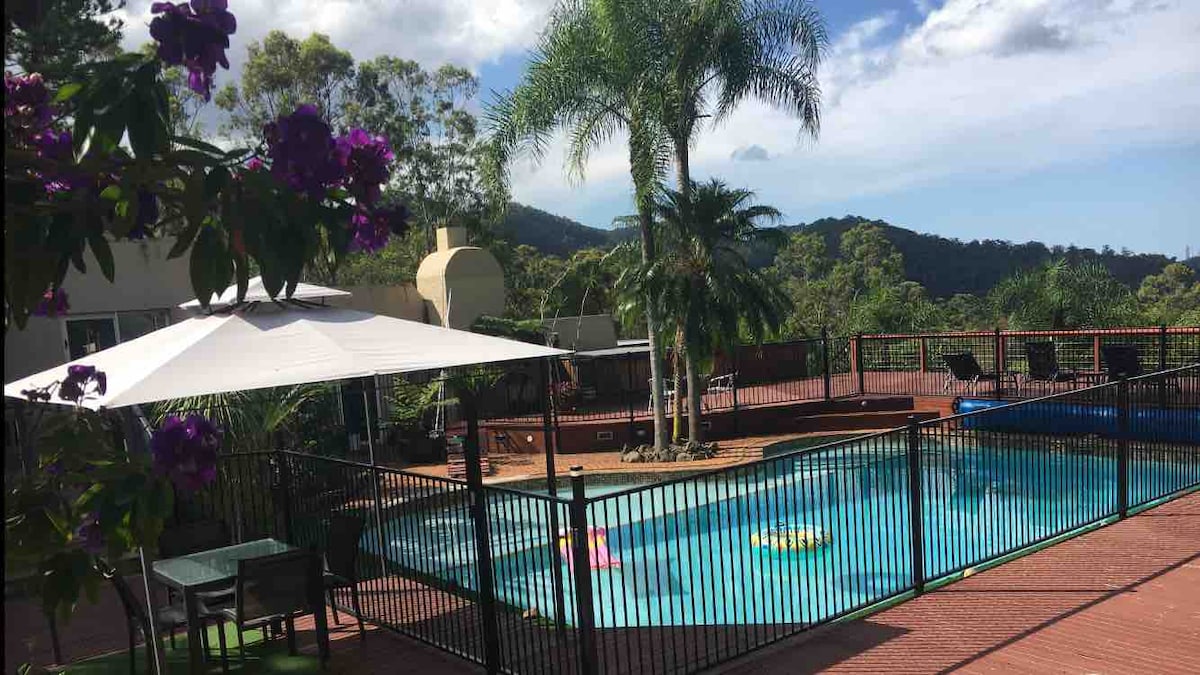 Somos un alojamiento SOLO PARA ADULTOS (niños mayores de 13 años acompañados por un adulto permitidos) que hospeda en un bloque de 8,5 acres en el monte natural con la casa situada a 200 metros de la carretera, abundancia de vida silvestre y vistas panorámicas costeras del horizonte de Gold Coast. Una ubicación única a pocos minutos de la M1. Se admiten mascotas (2 perros de raza pequeña como máximo y tarifa de limpieza adicional de 30 dólares, no se admiten gatos), aire acondicionado, piscina grande, jacuzzi, NBN, Foxtel, Netflix, casa de huéspedes totalmente independiente, cocina pequeña y baño separado. Te espera total privacidad y tranquilidad.