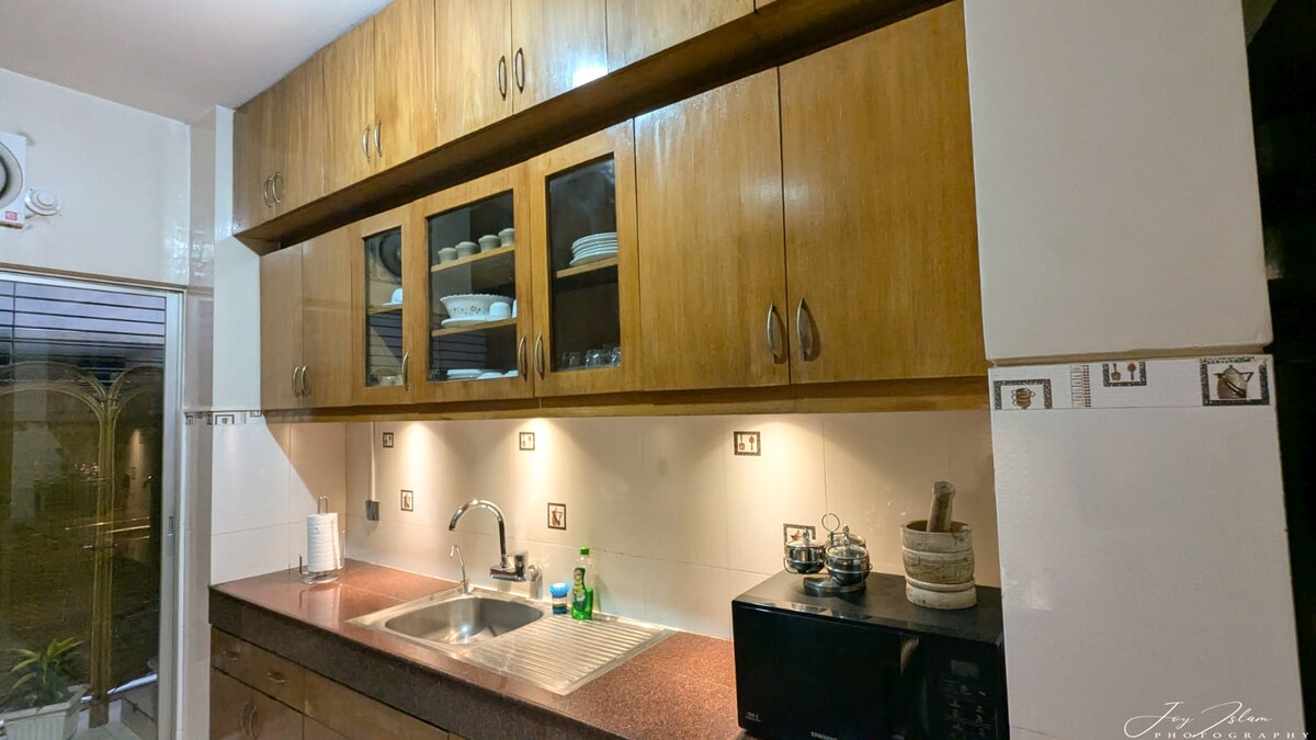 Esta acogedora casa en el cuarto piso combina comodidad y conveniencia con un dormitorio luminoso, un armario de pared, una sala de estar con TV, una sala de oración, una estación de trabajo y un comedor. La cocina incluye nevera, horno y filtro de agua de alta tecnología para una vida fácil. Los elementos esenciales como el geiser, el wifi y el aire acondicionado tanto en el dormitorio como en el salón garantizan la comodidad. Ubicado junto al outlet Gulshan Aarong y a poca distancia a pie de las tiendas de alimentos, es perfecto para leer tranquilamente, trabajar desde casa o simplemente relajarse para un máximo de 2 personas.