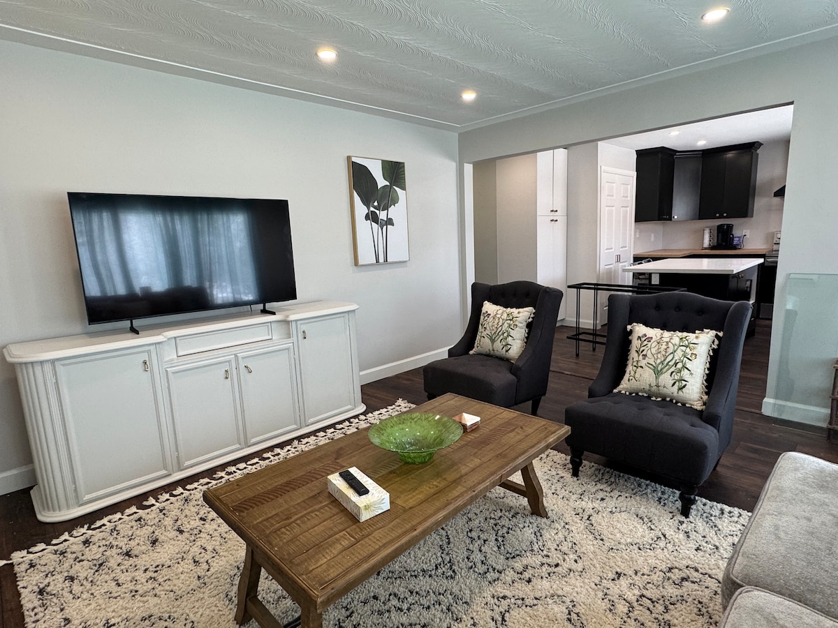 Disfruta de esta casa de 3 dormitorios y 2 baños, perfecta para familias o personas que viajan solas. ¡Escanea el código QR en la galería de fotos para hacer un recorrido en vídeo! Las comodidades incluyen: - Un jacuzzi de lujo para 7 personas - Barbacoa (línea de gas ilimitada) - Cargador de vehículos eléctricos gratuito ilimitado (compatible con Tesla) - Zona para trabajar. - 6 televisores, incluido un televisor inteligente 4K de 75 pulgadas - Todos los principales servicios de streaming. - Playstation 5 con juegos. - Cocina completa. - Lavadora y secadora. - Wifi de alta velocidad Bell Fibe. - Iluminación controlada por Alexa. - Fogata en el patio trasero.