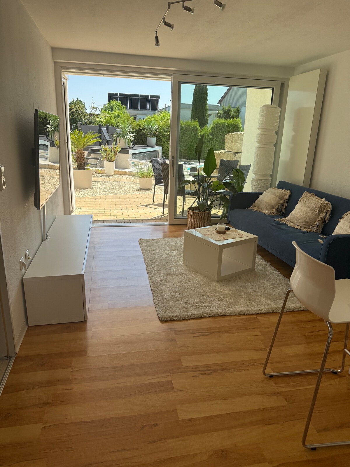 Vives con un máximo de 2 personas en la planta baja de nuestra casa. Hay una cama doble grande y cómoda en el dormitorio, una acogedora sala de estar con TV, cocina, baño e inodoro Eres rápido en las montañas o en el lago contanze. Independientemente de si buscas relajarte, viajar por negocios o planificar excursiones, encontrarás el punto de partida ideal para tus actividades. La ciudad y las tiendas están a tu alcance. El departamento tiene una ducha a ras de suelo y posiblemente un elevador de escaleras.