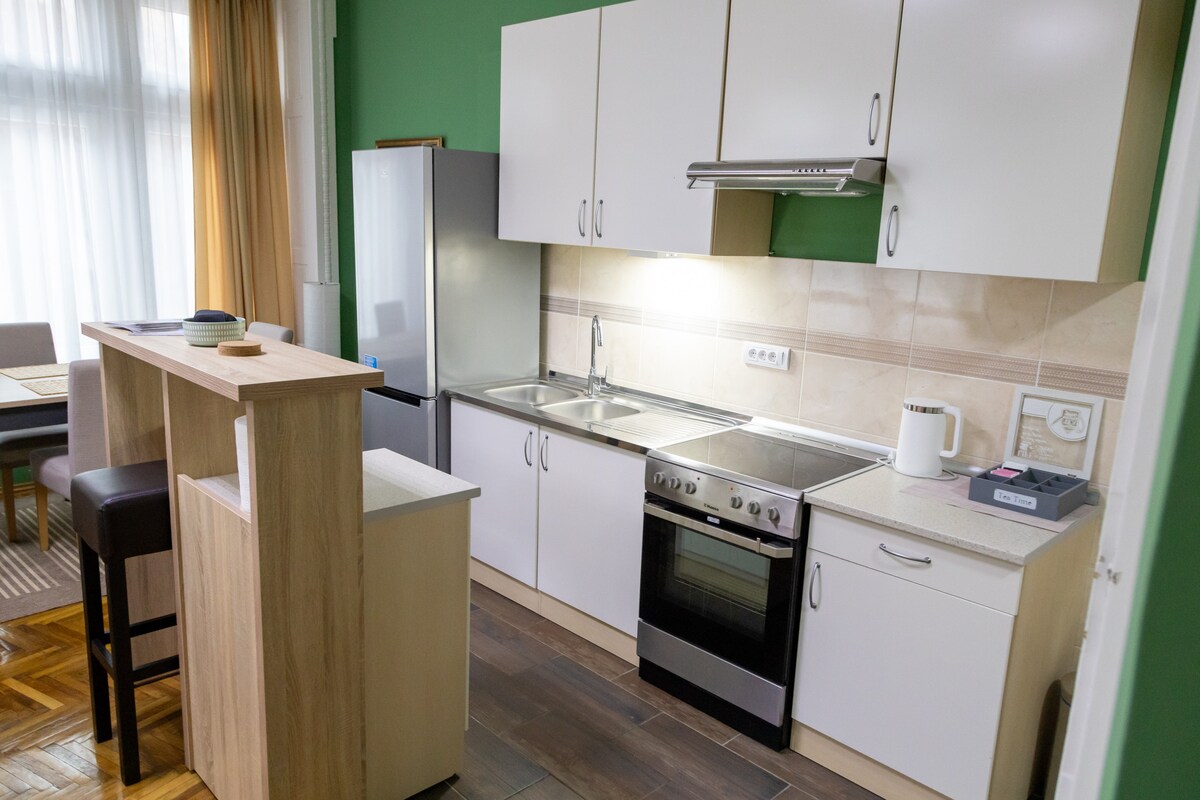 Apartamento totalmente equipado a poca distancia a pie del centro de la ciudad. El apartamento está situado enfrente del mercado de agricultores, donde puedes obtener ingredientes locales frescos (frutas, verduras, productos lácteos, carne). El centro de la ciudad está a 5 minutos a pie. Si disfrutas de la naturaleza, el parque Dudova Suma también se encuentra a 6 minutos. Los huéspedes podrán acceder al apartamento completo. Dos dormitorios, baño, cocina totalmente equipada y salón. El apartamento cuenta con wifi gratuito y TV por cable.