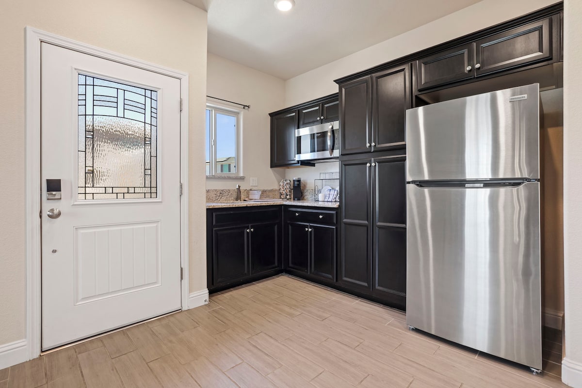 Disfruta de esta suite privada para huéspedes con entrada independiente para ti. La cocina pequeña está equipada con lo esencial, incluido un microondas+, una estufa de convección de un quemador, un refrigerador de tamaño completo con máquina de hielo y una isla de cocina portátil con ruedas y encimera de madera. Este minidepartamento está ubicado dentro de un vecindario de nueva construcción y se encuentra muy cerca de un parque/complejo deportivo privado.