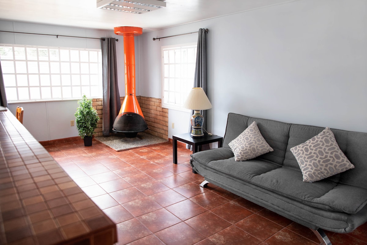 Casita caracol cuenta con una habitación con cama queen, y un futon cómodo en el área de sala comedor. Esta ubicado en la parte trasera de nuestra casa comunicados por el patio, alberca y un asador los cuales, son de uso exclusivo de las personas que se hospedan con nosotros . El lugar se caracteriza por ser muy tranquilo y rodeado de un lindo jardín. Contaras con acceso independiente a la casa, así como estacionamiento para 1 carro dentro de la propiedad, y en la parte exterior.