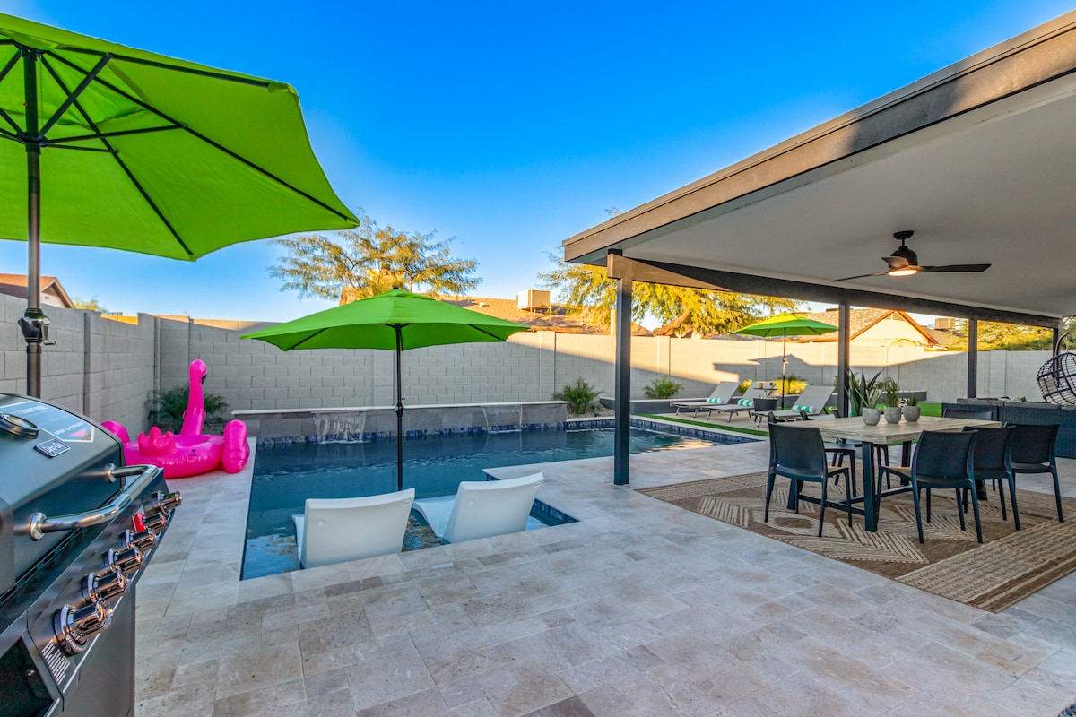 Family friendly Entertaining Home; Large covered patio with plenty of seating, fire table, Treager grill; Overlooking 10ft heated pool Oct-May (included). Amazing fully stocked chefs kitchen- double ovens, gas cooktop. All bedrooms have comfy beds and smart TVs. A perfect location for your Arizona getaway. Only 0.8 miles from the State Farm Stadium, Desert Diamond, Westgate with tons of local restaurants and adventures avoid traffic and walk to your event! Discounts for stays 5 nights and up.