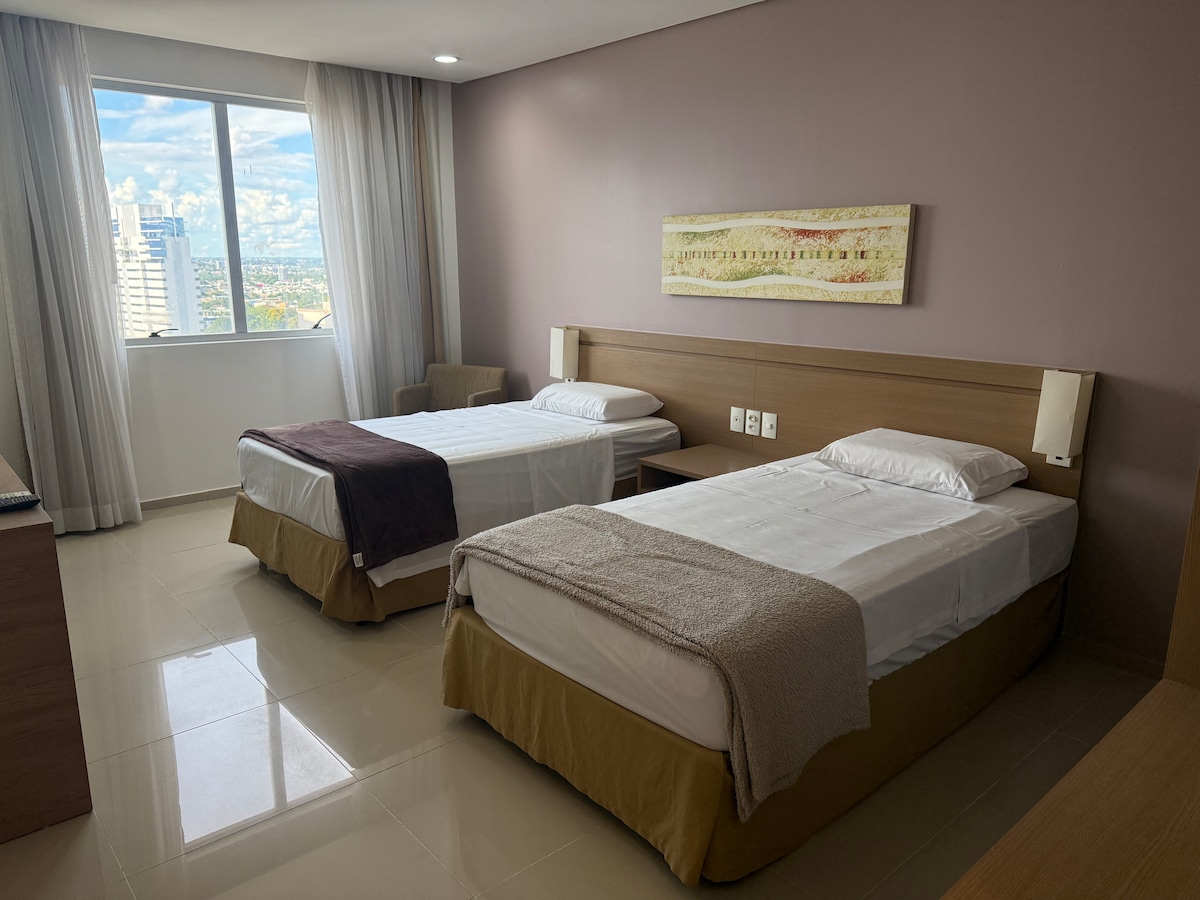 Apartamento con vistas a Río Negro en el Tropical Executive Hotel ubicado en Ponta Negra La habitación tiene TV de pantalla plana por cable, tabla de planchar, plancha, microondas, hervidor de agua, aire acondicionado, minibar, platos, cubiertos, vasos y tazas, secador de pelo, ajuar completo, jabón. No tenemos desayuno incluido. El restaurante del hotel ofrece un desayuno tipo bufé que cuesta R$72,00 por persona de 6:00 a 10:00 a. m. con pago directo. Limpieza todos los días.