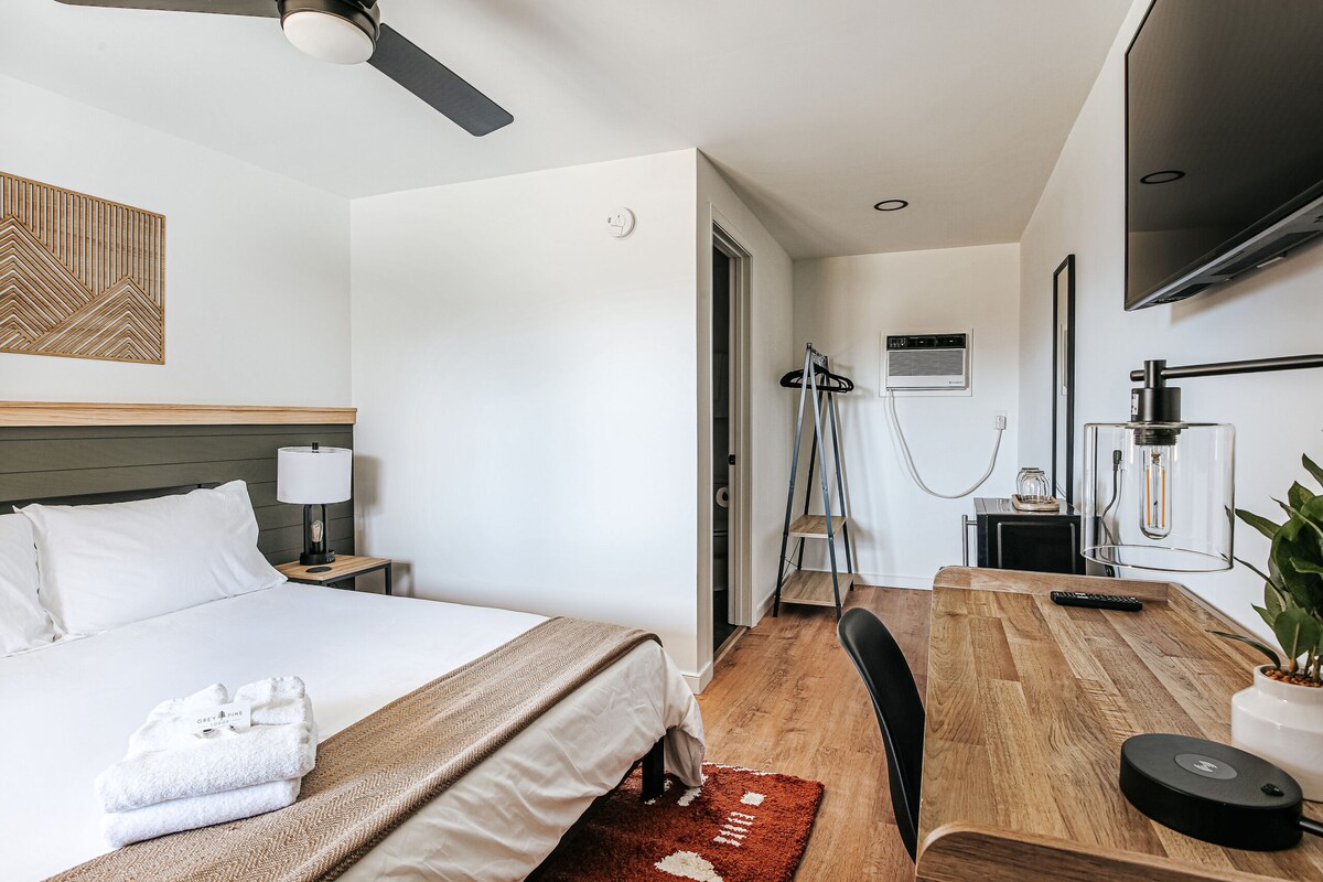 Jeff Suite 204: ¡Frente al centro comercial! Cada habitación está amueblada individualmente con una personalidad distinta. Piensa en colores frescos, gamuza cremosa y colores del desierto con toques de humor peculiar. Para garantizar la privacidad y un verdadero ambiente de escapada, The Jeff se diseñó para ser completamente de autoservicio (sin recepción ni necesidad de registro). Al reservar, recibirás un código único que te dará acceso a tu habitación.