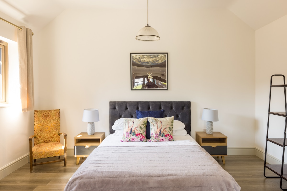 The Barn es un moderno espacio de estudio totalmente equipado que está rodeado de campo abierto. Disfruta de este romántico escondite con alguien especial. Mira Netflix en tu propia pantalla de cine. Recoge algunos productos frescos en la tienda de productos agrícolas local. Cocina una comida gourmet en tu cocina privada o cena en restaurantes y pubs. Pasa una noche haciendo una barbacoa con vistas a un amplio jardín y al campo abierto. Da un paseo por los numerosos senderos o juega al golf en uno de los tres campos cercanos.