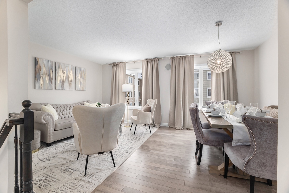 Bienvenido a esta hermosa casa adosada de 3 plantas, construida en 2020. Diseñada pensando en el máximo confort. Perfecta para relajarse y explorar Ottawa. * A 5 minutos del Centro Canadian Tire. - Hogar de los Senadores de Ottawa de la NHL - - Conciertos y eventos - * A 5 minutos de Bell Sensplex * A 5 minutos de Tanger Outlets * A 10 minutos de Kanata * A 20 minutos del Commissioners Park * A 25 minutos de Lansdowne Park. * A 25 minutos del centro de Ottawa. * A 40 minutos de Nordik Spa.