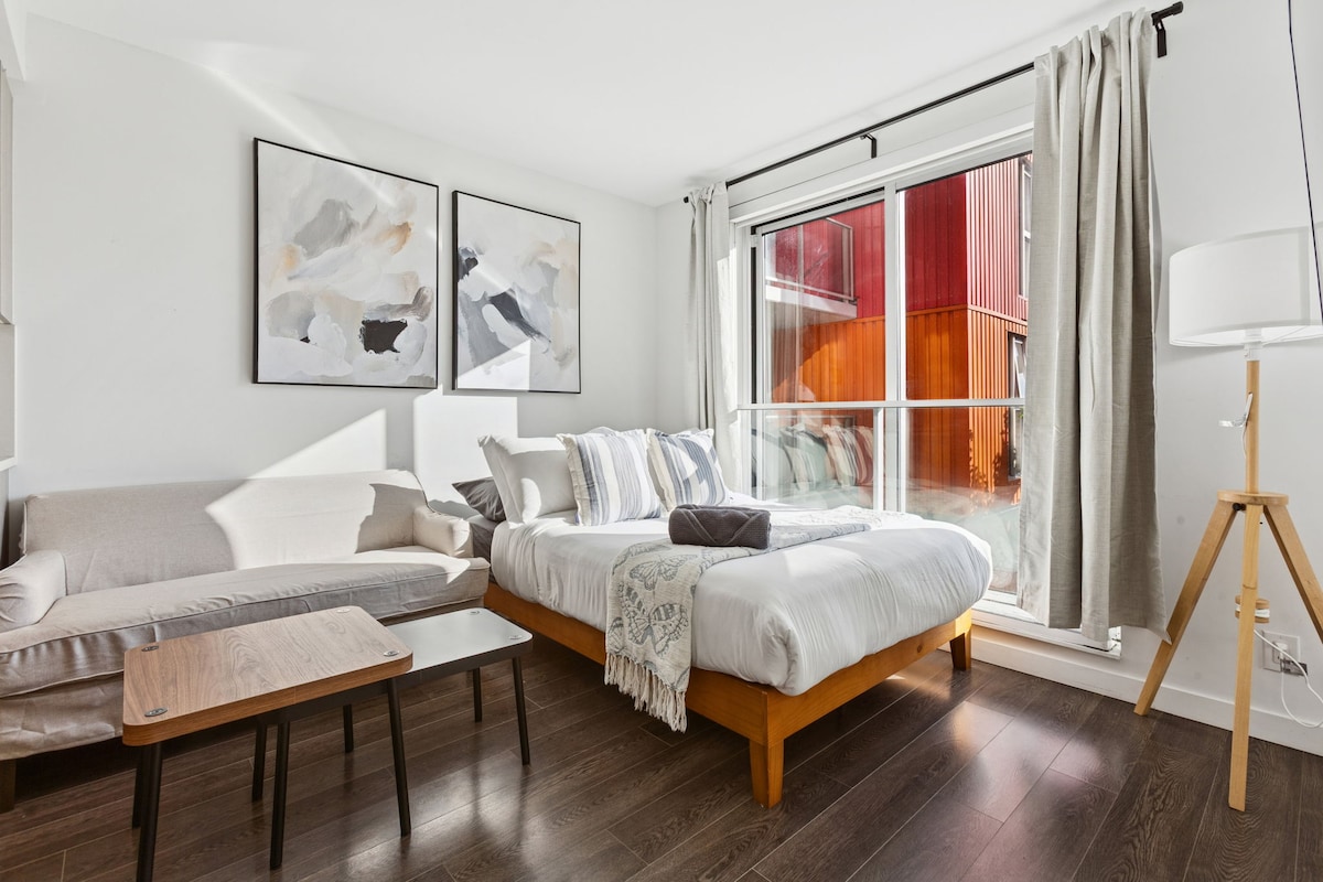 Alójate en un apartamento de estilo bohemio que está increíblemente cerca del centro de Vancouver. Este impresionante apartamento de 1 dormitorio es el punto de partida perfecto para explorar la rica historia y los monumentos culturales de la ciudad. El apartamento cuenta con un dormitorio tamaño queen luminoso, una cocina moderna totalmente equipada y una acogedora sala de estar con un sofá cama grande para un sueño reparador. ¡Disfruta de todas las comodidades que necesitas para una estadía cómoda en Vancouver!