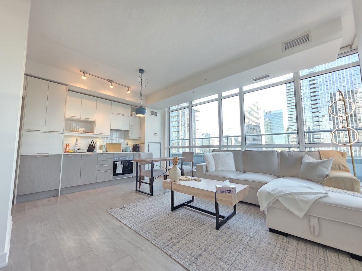 Elegante condominio en el centro de la ciudad ubicado en el vibrante corazón de Toronto junto al Scotiabank Arena. Ya sea que estés aquí por un juego, un concierto o simplemente para explorar la energía de la ciudad. El apartamento está a pocos pasos de Rogers Centre, la Torre CN, Harbourfront y los mejores restaurantes incluidos. El alojamiento está totalmente equipado con todo lo esencial para que disfrutes de una estancia sin estrés. Encontrarás un espacio de trabajo exclusivo para días remotos, una cocina totalmente equipada y acogedoras salas de estar ideales para relajarse.