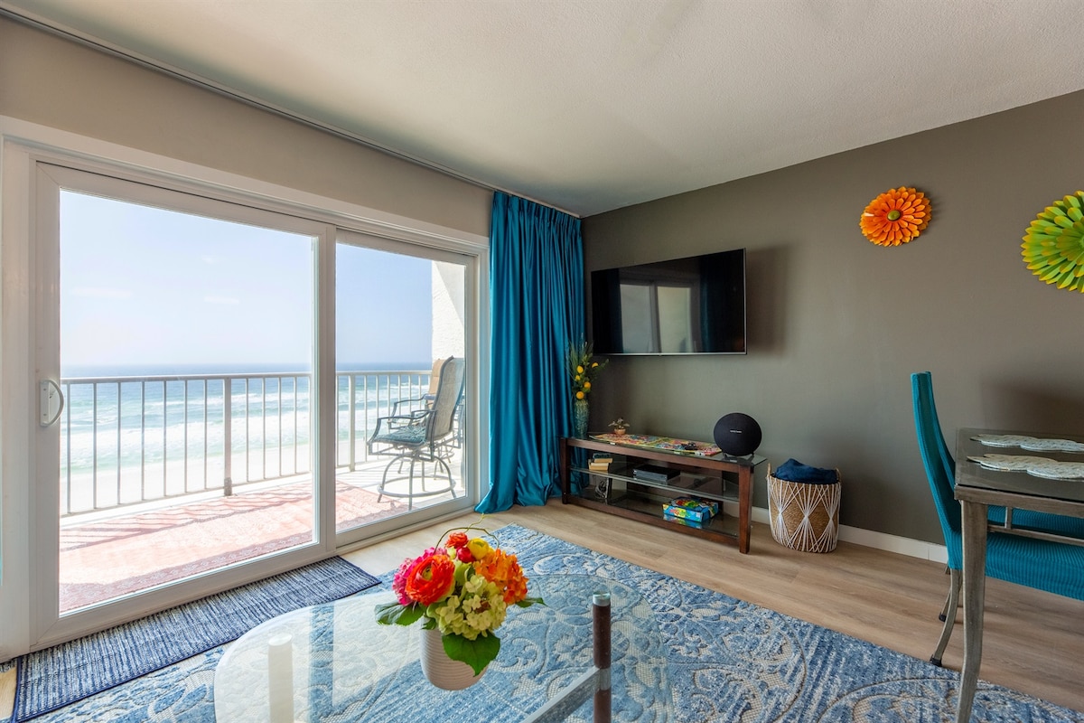 Frente a la playa. ¡Sin restricciones de edad! Balcón frente al golfo con vistas increíbles y un ambiente magnífico. En el tercer piso, puedes evitar los ascensores ocupados si puedes subir 3 tramos de escaleras. Apartamento de un dormitorio + litera y 1,5 baños con capacidad para un total de 6 personas. Dormitorio principal: 1 cama tamaño king con baño completo y tocador. El pasillo cerrado con una puerta tiene capacidad para 2 personas en una litera. Sala de estar: 1 sofá cama tamaño queen. Cocina completa equipada con cafetera, licuadora, tostadora, olla de cocción lenta, utensilios de cocina y platos. Wifi