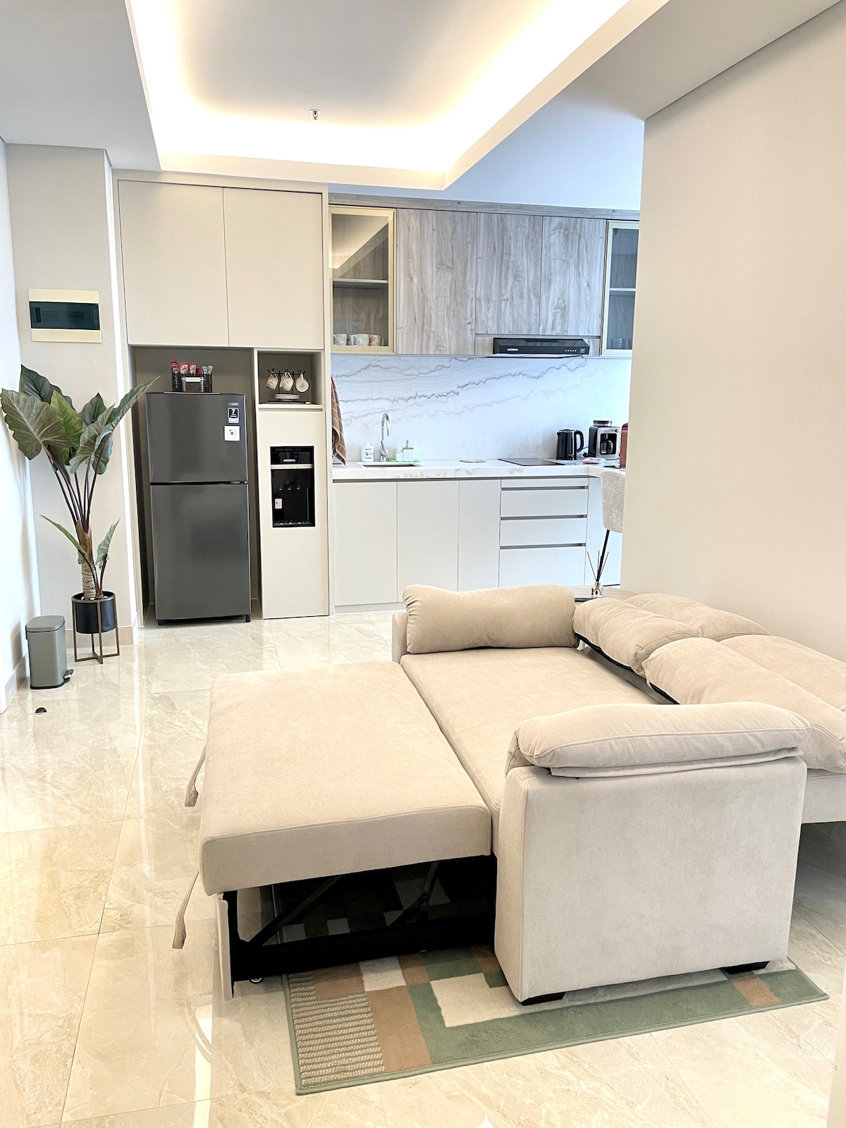 Tenemos un elegante y hermoso y elegante apartamento de 2 dormitorios diseñado en el piso 31 con vistas a la ciudad para que tu estancia sea tranquila y relajante. Capacidad : 4 hasta 6 personas 2 dormitorios con cama queen (160x200 cm) marca Setra 1 Sofá cama (147x160 cm) 1 baño 1 lavadora manual 1 purificador de aire Xiaomi Con una cocina y un comedor totalmente equipados y limpiando la aspiradora, queremos que tu día relajante con la familia o los familiares esté más encantado. Esperamos que disfrutes de tu estancia con nosotros.