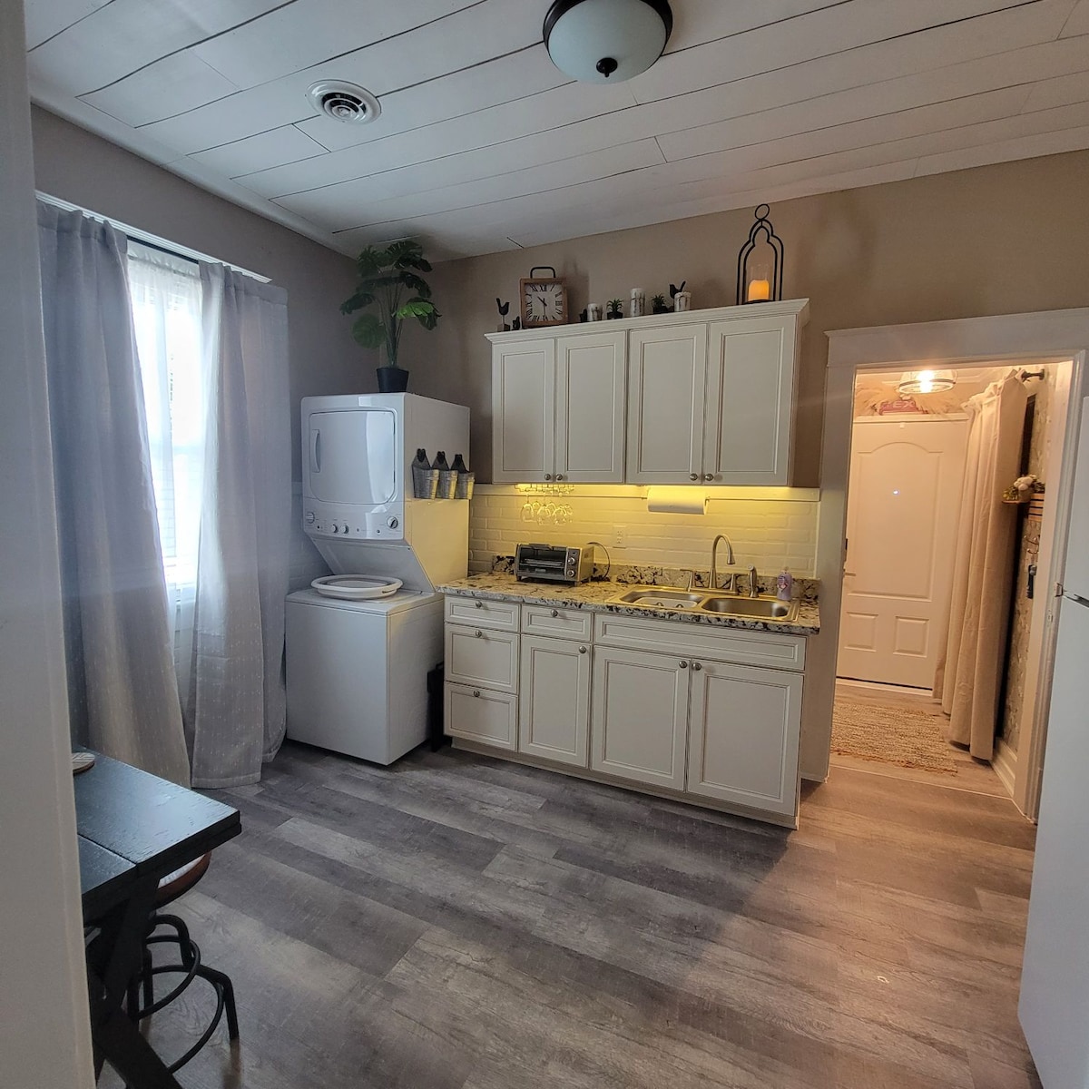 Enjoy a stylish experience with some new and older kept features that Rustic Charm has to offers in this centrally located place. Rustic Charm is sure to make any stay fun, comfy, &cozy. 1 bd rm with a king size bed, a closet, & a safe to store your personal belongings. The living room offers an Indoor hammock chair (350 lb wt limit) that you can relax in after a long day. 2 smart tvs with high speed internet and streaming services available. Year round electric fireplace in the bedroom.