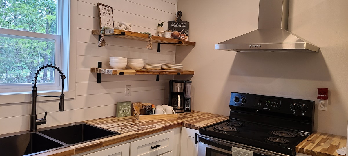 La tienda es tan única como acogedora, con todas las comodidades de tu hogar y una sala de estar en el garaje que es perfecta para las noches de juego. La casa está a solo unos minutos de la ciudad, ubicada en 4 acres con vistas a hermosos paisajes. 1 dormitorio y 1 baño, esta casa está recién reformada con todas tus necesidades esenciales con conexión para lavadora/secadora, cafetera, acceso a wifi, juegos y chimenea al aire libre. Con mucho espacio de estacionamiento fuera, el garaje también ofrece un área de 2 bahías.