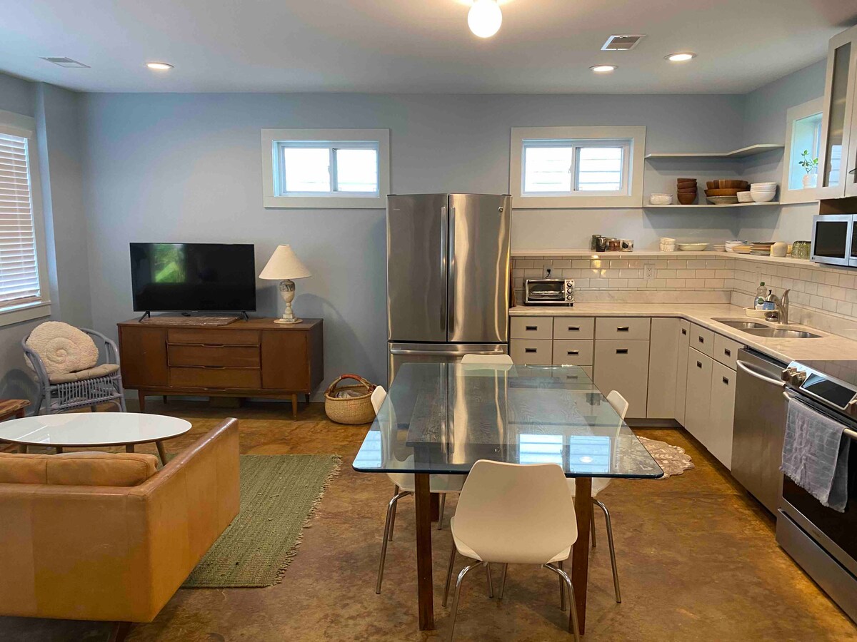 Relax and unwind in this beautiful private guesthouse, perfectly located just minutes from shopping, dining, entertainment, and the beach. Upon arrival, enjoy chilled bottled water waiting just for you. As evening falls, take a peaceful stroll along the nearby nature trail and catch a stunning sunset from the neighborhood dock. When you return, settle in for the night with your favorite movies on the 70” smart TV—no shared armrest required. Come stay, relax, and make this getaway all about you.