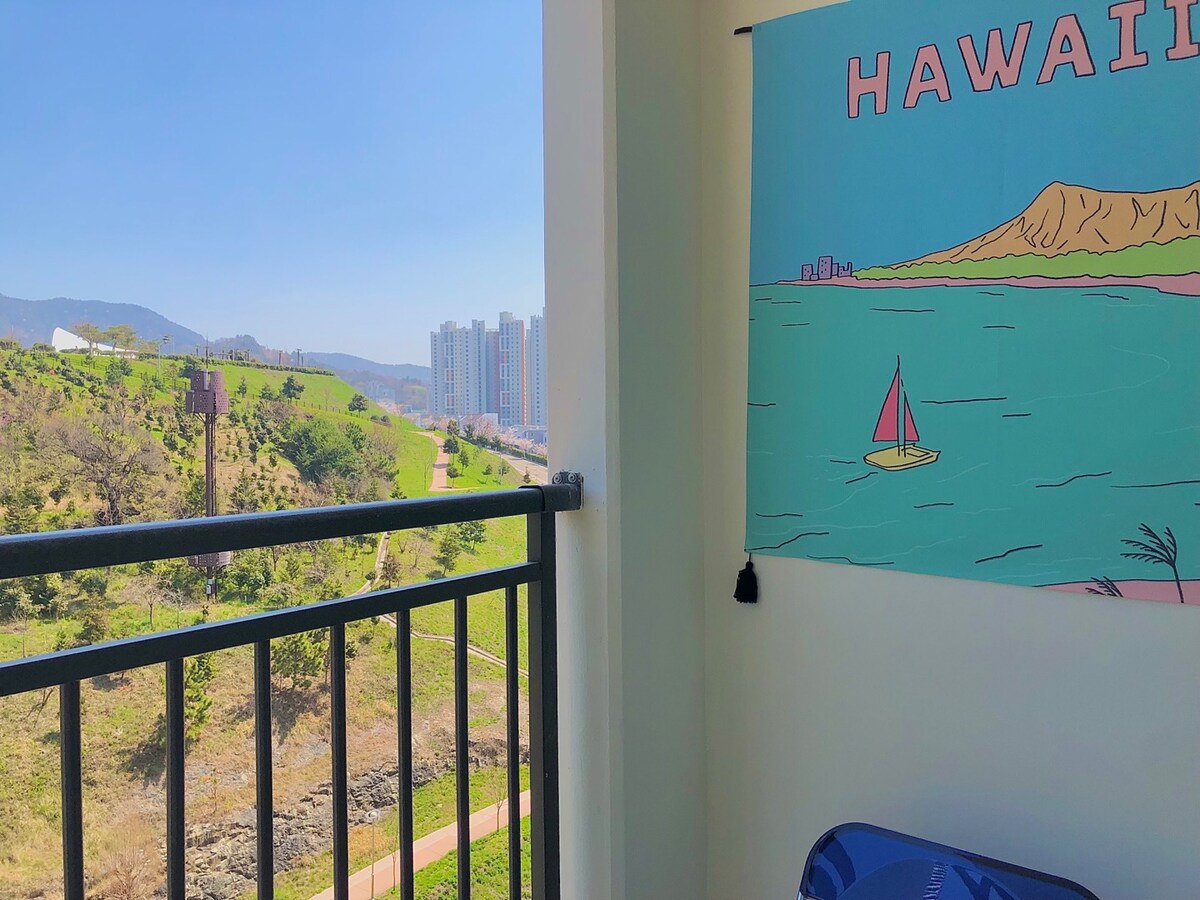 -Aloha Stay: Aloha Stay es un alojamiento romántico, cálido y exótico como la luz del sol, ubicado en el centro de Uncheon, Sindo-sim, donde podrás disfrutar de la vida urbana práctica, como ir al supermercado y a los centros comerciales, y al mismo tiempo, curarte en silencio en la naturaleza, ya que hay parques y mares cerca. Justo enfrente hay un mar magnífico donde yates y barcos surcan las olas, y detrás está el Parque Yi Sun-shin con vista al mar amplio y fresco, y el atardecer en el centro de la ciudad desde el Parque Cultural de la Playa, a 5 minutos a pie, brindará una curación diferente. Ubicado en el centro de Yeosu, cerca de KTX, el aeropuerto, Dolsan Cable Car, Odongdo, desde el Romantic Carriage hasta Baekyado Es el lugar ideal para ir a los lugares turísticos de Yeosu, desde la isla de Nangdo. Además, si desea disfrutar de un ambiente lujoso y limpio con su familia y su pareja, quédese aquí, en Aloha Stay.
