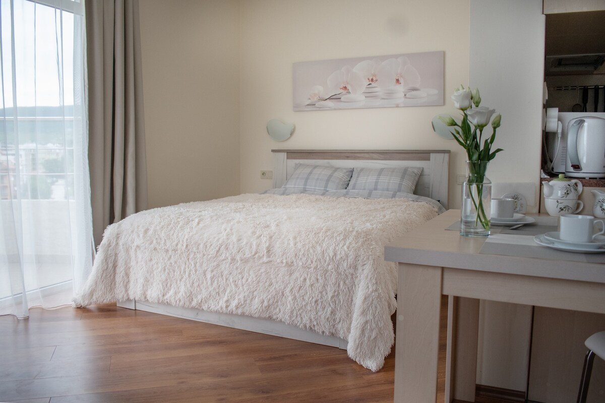 Bienvenido a un acogedor estudio de 54 m kV, a 7 minutos del mar. Cerca hay tiendas,cafeterías,bancos, una clínica, una farmacia, un centro tranquilo. El apartamento tiene una cama doble nueva y un sofá plegable, armario, cómoda, cocina completa con horno,microondas, molinillo de café...Un juego de platos y todo lo necesario para cocinar. Y también aire acondicionado,frigorífico y lavadora. TV 32 LG SMART, wifi 50. En el territorio del complejo hay una gran piscina y 2 para niños, aparcamiento gratuito,ascensores. Para la playa hay una sombrilla y ropa de playa