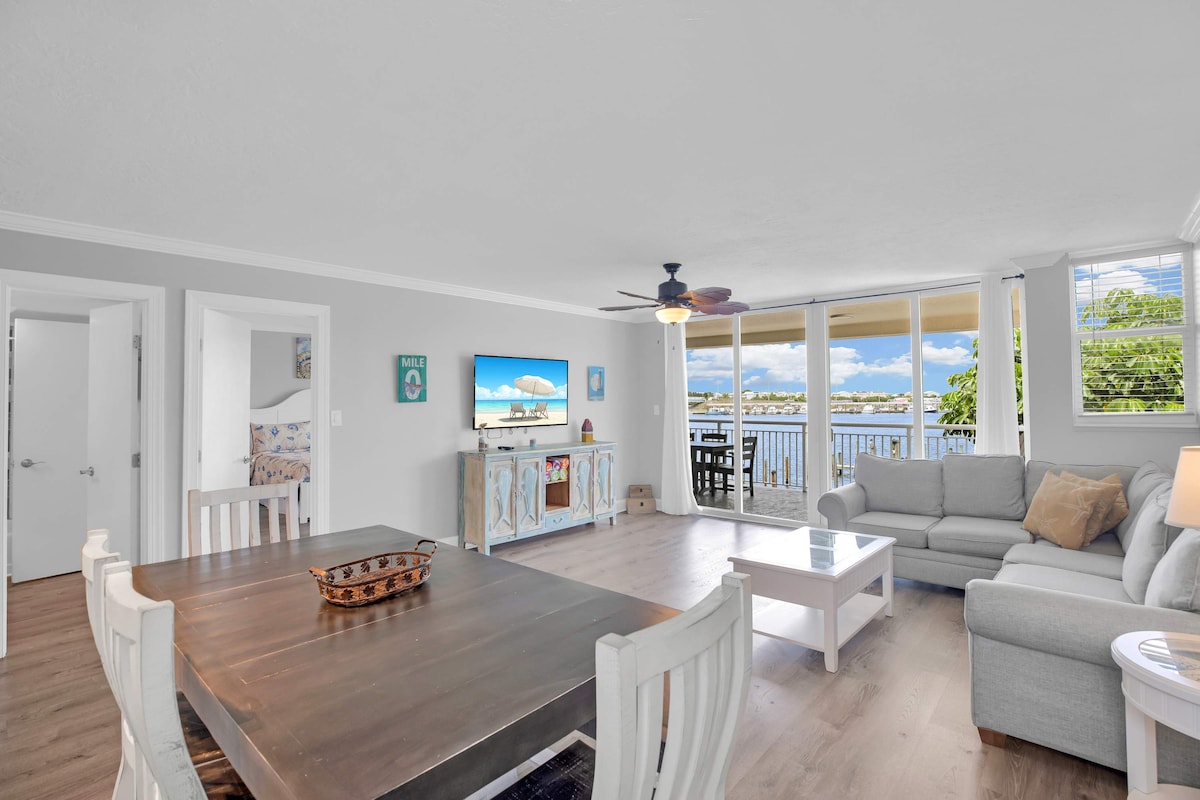 Updated waterfront 2BR/2BA with King Master, 2nd Queen and pullout couch. 35' seawall—bring your boat! Enjoy a fully stocked quartz kitchen with stainless appliances. Located in Venture Out, a quiet, family‑friendly gated resort with fishing, lobstering, pools, hot tub, pickleball, tennis, basketball, rec center, bikes, kayaks, and SUPs. Between Key West (20 mi) and Marathon. Free WiFi; Roku TVs in both bedrooms and living room. Kayaks, SUPs and storage area with extra fridge and bait freezer.
